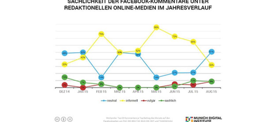 Bei der Analyse der Sachlichkeit, also der sprachlichen Äußerungen in Facebook-Kommentaren, zeigt sich ein ähnlich überraschendes Bild. Vulgäre Äußerungen – bspw. Fäkalsprache und/oder starke Beleidigungen – finden sich im Schnitt lediglich in 2% der Beiträge. Dem gegenüber stehen die auch eher selten zu sehenden sachlichen Beiträge. Diese beinhalten eine tiefergehende Argumentation mit Hinweisen auf weiterführende Literatur, Seiten der Bundesregierung o.ä. Auch sie machen im Schnitt nur ca. 4% der monatlichen Beiträge aus. Die Beiträge, die mit Abstand überwiegen, sind sprachlich neutraler oder zumindest informeller Art. Es handelt sich um Alltagssprache, die, wenn überhaupt, nur leichte Kraftausdrücke beinhaltet.