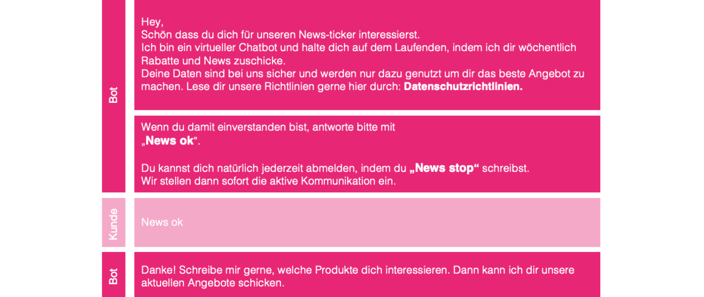 3. Dem Kunden muss die Möglichkeit gegeben werden, die Einwilligung zu widerrufen. z.B. durch das Senden einer „Stop“ Nachricht.